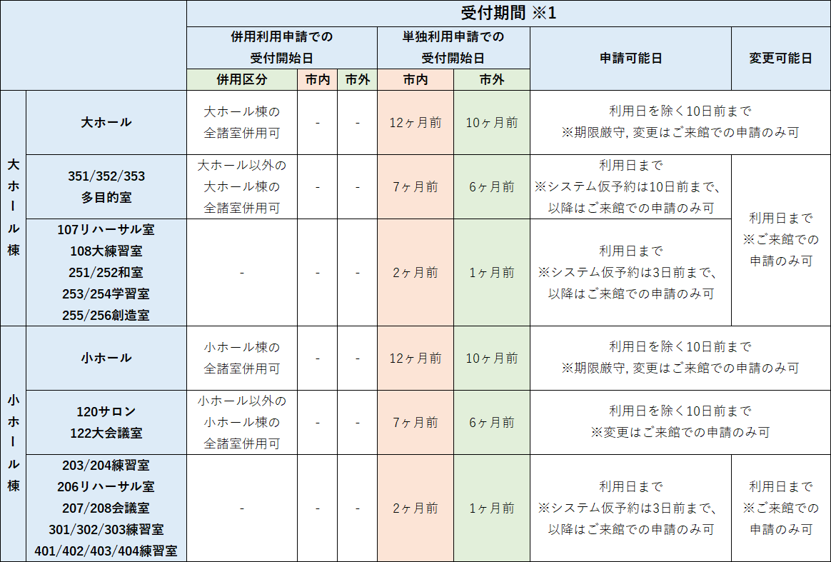 • ただし施設利用申請の受付開始日は、会館窓口にて8:45から9:00までに事前にご希望を伺い、同じ施設・希望日・時間が重なった場合は9時に抽選を行います。