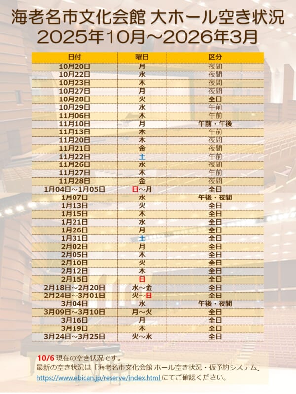 大ホール2025年10月~2026年3月の空き状況につきまして、下記の通りご案内いたします。
