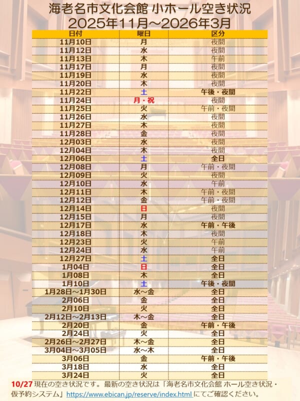 2025年10月27日 小ホール 2025年11月~2026年3月 空き状況のご案内