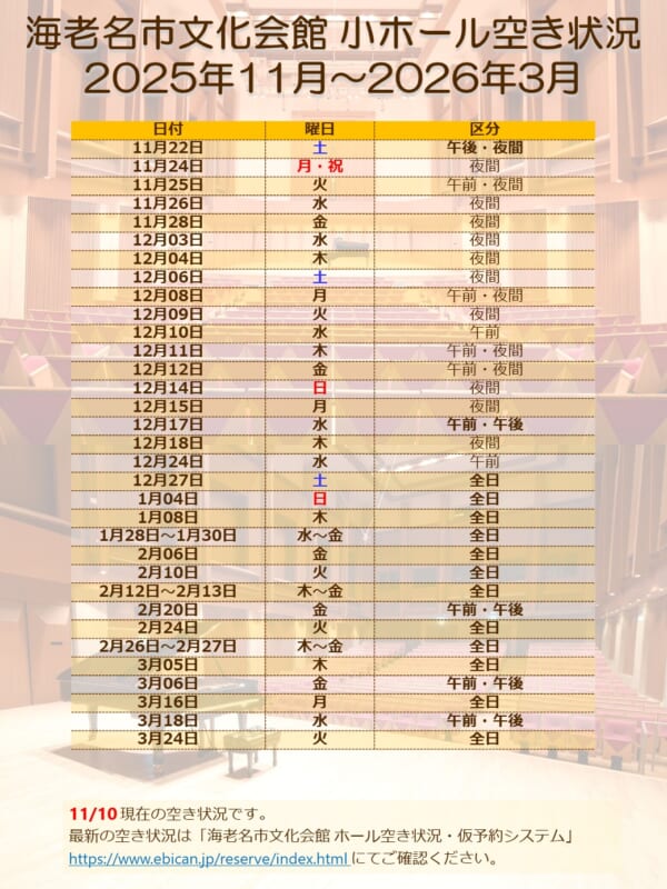 2025年11月10日 小ホール 2025年11月~2026年3月 空き状況のご案内