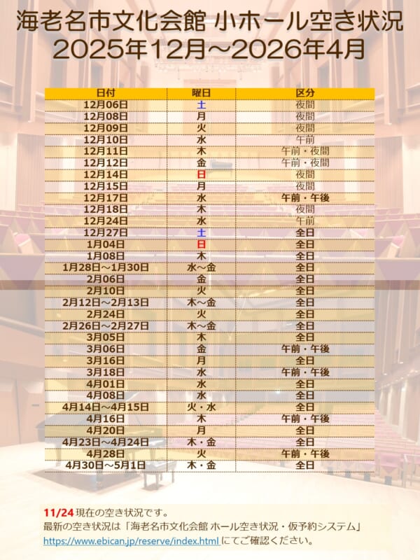 2025年11月24日 小ホール 2025年12月~2026年4月 空き状況のご案内