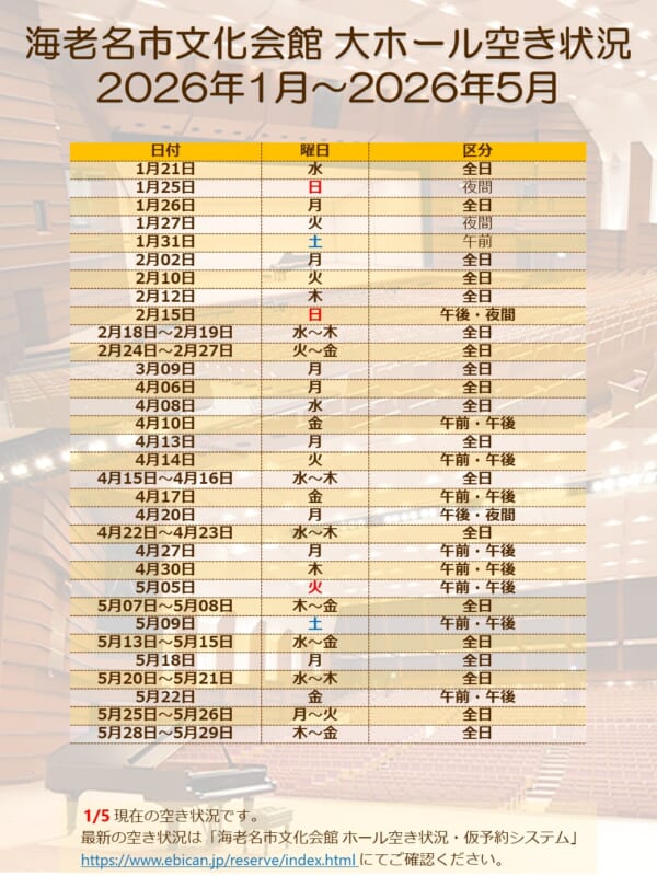 最新の空き状況は「海老名市文化会館 ホール空き状況・仮予約システム」https://www.ebican.jp/reserve/index.html にてご確認ください。