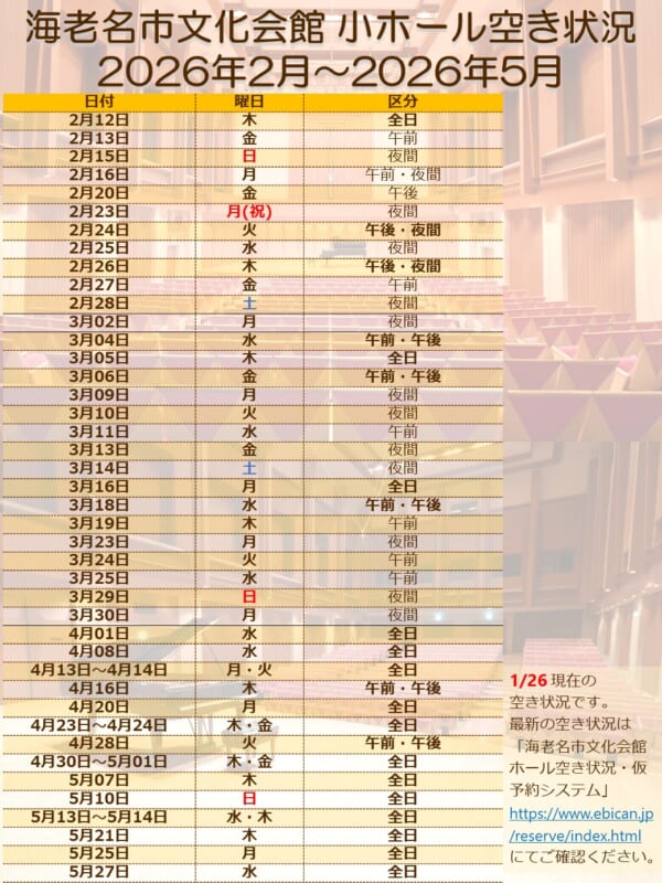 最新の空き状況は「海老名市文化会館 ホール空き状況・仮予約システム」https://www.ebican.jp/reserve/index.html にてご確認ください。