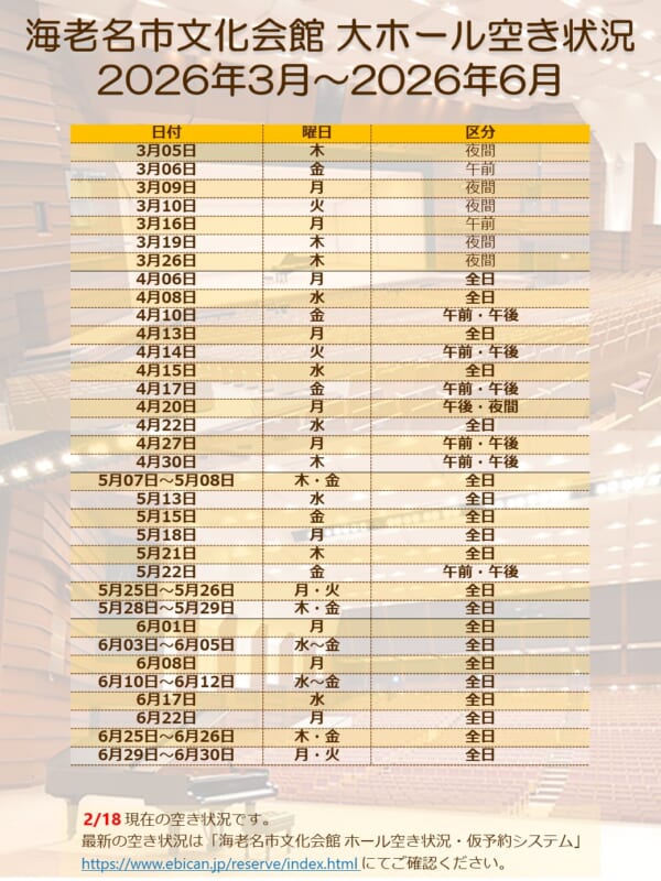 最新の空き状況は「海老名市文化会館 ホール空き状況・仮予約システム」https://www.ebican.jp/reserve/index.html にてご確認ください。