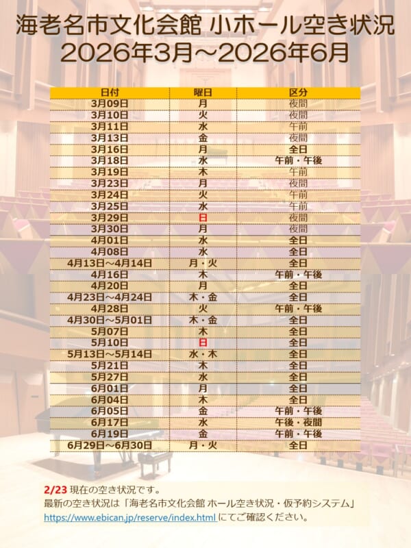 最新の空き状況は「海老名市文化会館 ホール空き状況・仮予約システム」https://www.ebican.jp/reserve/index.html にてご確認ください。