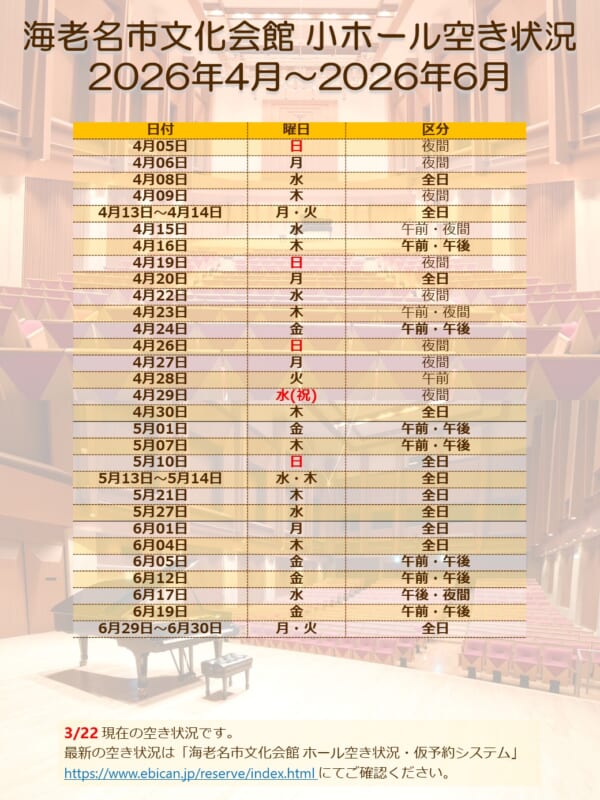 最新の空き状況は「海老名市文化会館 ホール空き状況・仮予約システム」https://www.ebican.jp/reserve/index.html にてご確認ください。