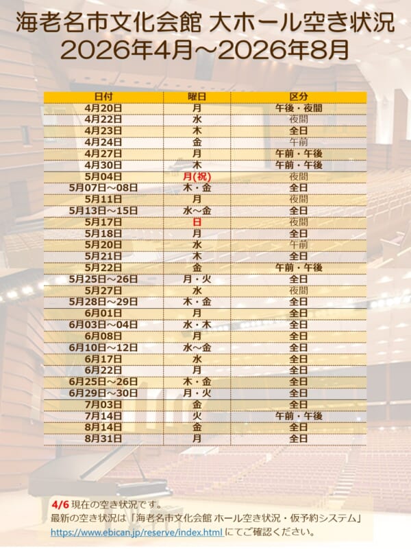 最新の空き状況は「海老名市文化会館 ホール空き状況・仮予約システム」https://www.ebican.jp/reserve/index.html にてご確認ください。