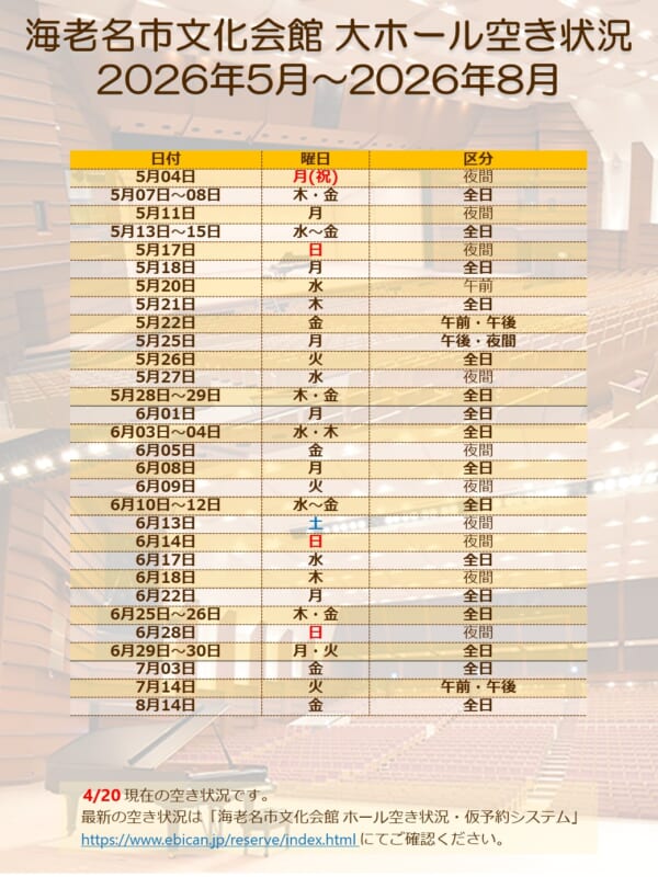 2026年4月20日 大ホール 2026年5月~2026年8月 空き状況のご案内